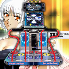 The player stands on a metal stage in front of the main screen/unit. There are four arrows on each player's side (the four cardinal directions) on which the player can step. On the screen, arrows matching the direction of the arrows on the stage will scroll on the screen. When the moving arrows line up with the stationary arrow "casting" at the top of the screen, the player (should) step on the corresponding arrow. The arrows scroll up (or down) the screen amidst psychadelic backgrounds/dancing characters (and in the newer mixes, animated movies). |